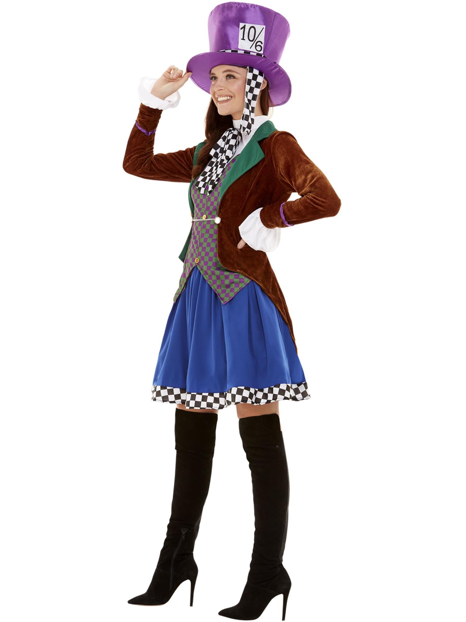 Miss Hatter Costume, Multi-Coloured with Jacket, Attached Waistcoat, Skirt & Hat