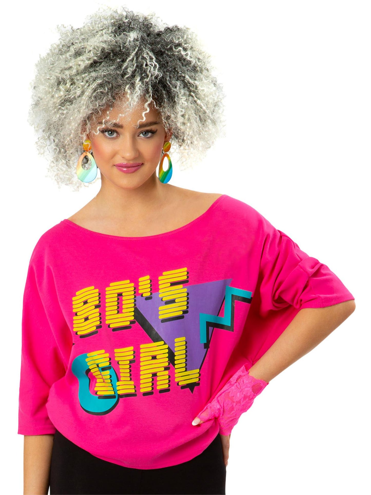 80s Girl Bat Wing T-Shirt, Neon Pink, Printed