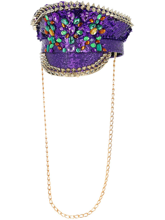 Sombrero de capitán Fever Deluxe con adornos de lentejuelas, morado, con cadena